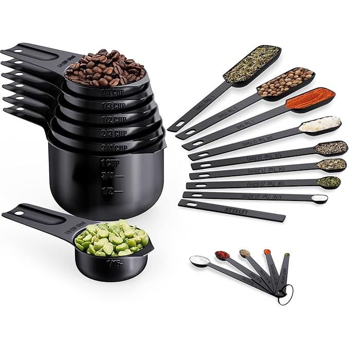 Wildone Black Measuring Cups & Spoons Set of 21 - Includes 7 Stainless Steel Nesting Measuring Cups, 8 Measuring Spoons, 1 Leveler & 5 Mini Measuring Spoons, Ideal for Dry & Liquid Ingredients