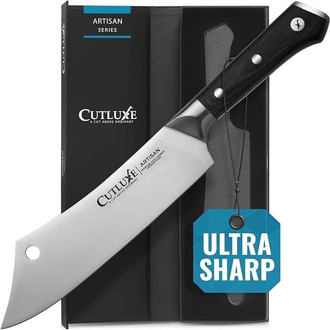 Say goodbye to hand and wrist strain thanks to the ergonomic handle design of the Cutluxe Cleaver Chef Knife, offering a comfortable and secure grip that allows for extended use without fatigue. Part of the Artisan Series, this knife is a true testament to exceptional craftsmanship and meticulous attention to detail. With a hand-sharpened razor-sharp blade, chopping, dicing, and slicing are made effortless in any kitchen setting.