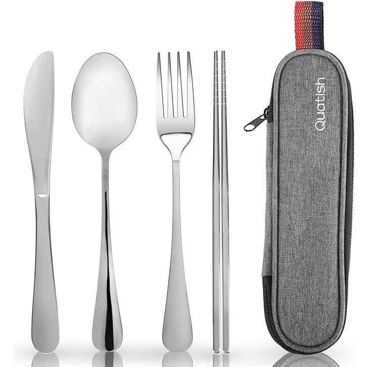 Travel Utensils with Case, Quatish Portable Utensil Set for Work, Stainless Steel Reusable Travel Cutlery Set, Spoon and Fork Set for Camping, Picnic, Gadgets, Men Lunch Box, Silver
