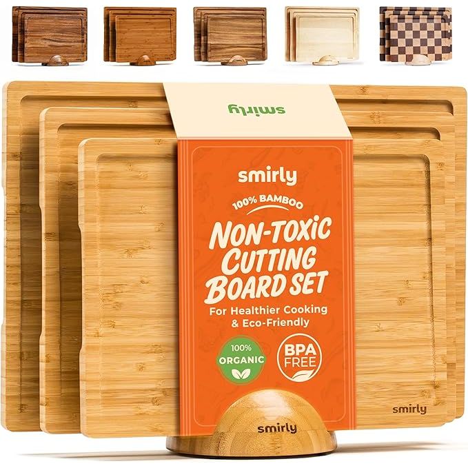 SMIRLY Wooden Cutting Boards for Kitchen - Bamboo Cutting Board Set, Chopping Board Set - Wood Cutting Board Set with Holder - First Apartment Kitchen Essentials, New Home Kitchen Accessories