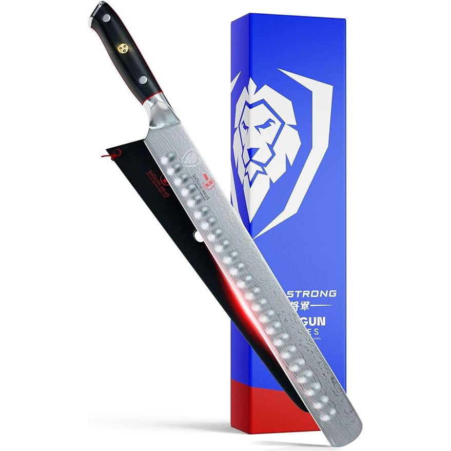 Experience the precision and reliability of the Dalstrong Slicing Knife, a 12-inch blade crafted from top-notch Japanese steel in the classic Damascus style. The Granton edge prevents food from sticking and ensures clean cuts, while the G10 handle offers a comfortable and secure grip for extended use. This slicing knife is a standout in the renowned Shogun Series ELITE by Dalstrong, known for its exceptional craftsmanship and durability.