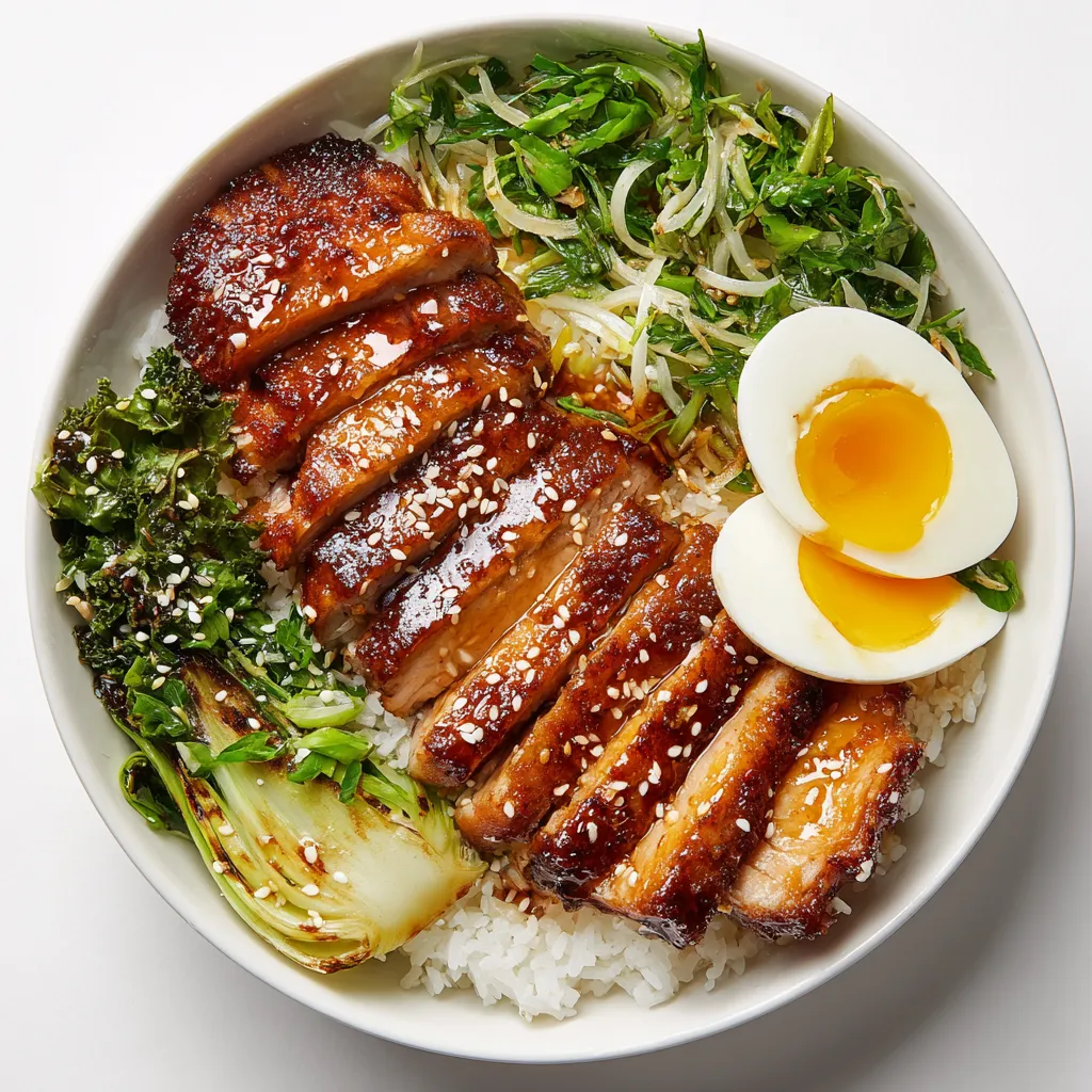 - Arrange the pork chops atop the rice, followed by the sautéed pickled vegetables, steamed cabbage, and half of the hard-boiled egg.