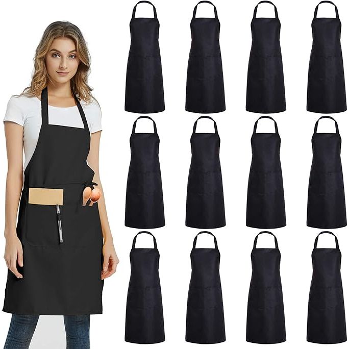 Enhance your commercial kitchen or restaurant with this 12 Pack Plain Bib Aprons, perfect for a variety of uses including BBQs, painting, crafting, and more. Crafted from a durable polyester-cotton blend, these aprons are easy to clean and maintain for long-lasting use. The sleek black color and unisex design make them versatile for both men and women in various settings.