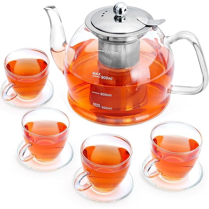Glass Tea Set - 1200ml Teapot with Removable Infuser and 4 Teacups, Stovetop Safe Kettle Gift Set, Tea Maker Set