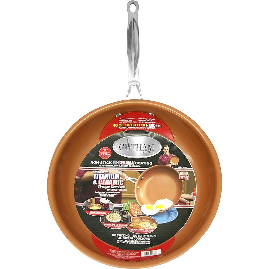 Experience effortless cooking and cleaning with the Gotham Steel 11 Inch Non Stick Frying Pan. This skillet is equipped with a durable ceramic copper coating that provides a long-lasting nonstick surface for a wide range of cooking methods, from frying and sautéing to simmering and baking. With its 11-inch size, you'll have plenty of space to cook multiple ingredients at once.