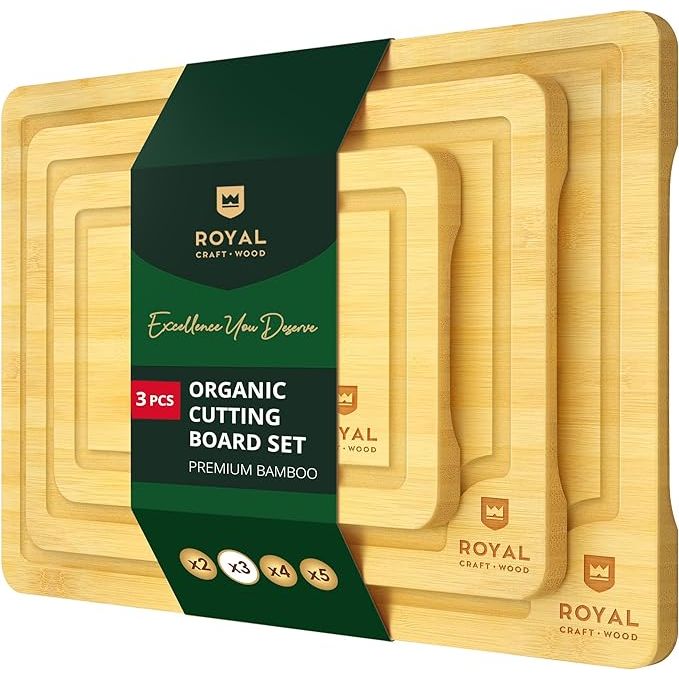 Bamboo Cutting Board Set by ROYAL CRAFT WOOD - Set of 3 Boards with Juice Grooves and Easy Grip Handle